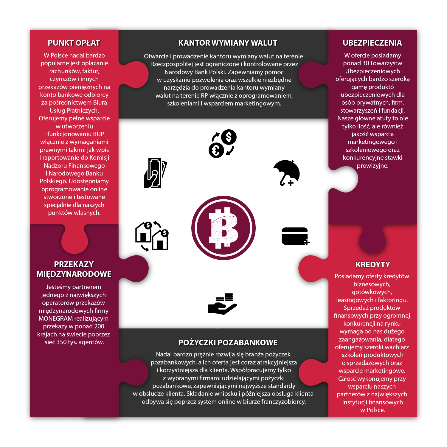 Jeżeli zastanawiasz się nad własnym biznesem, który zapewnia stabilny rozwój i dochody (a ich poziom uzależniony jest od Twojego zaangażowania), to nasza oferta skierowana jest właśnie do Ciebie. Posiadamy kilkuletnie doświadczenie w prowadzeniu własnych punktów finansowo-ubezpieczeniowych. Dlatego możemy podzielić się bogatą wiedzą, doświadczeniem oraz narzędziami niezbędnymi do szybkiego i co najważniejsze skutecznego rozpoczęcia własnej działalności.